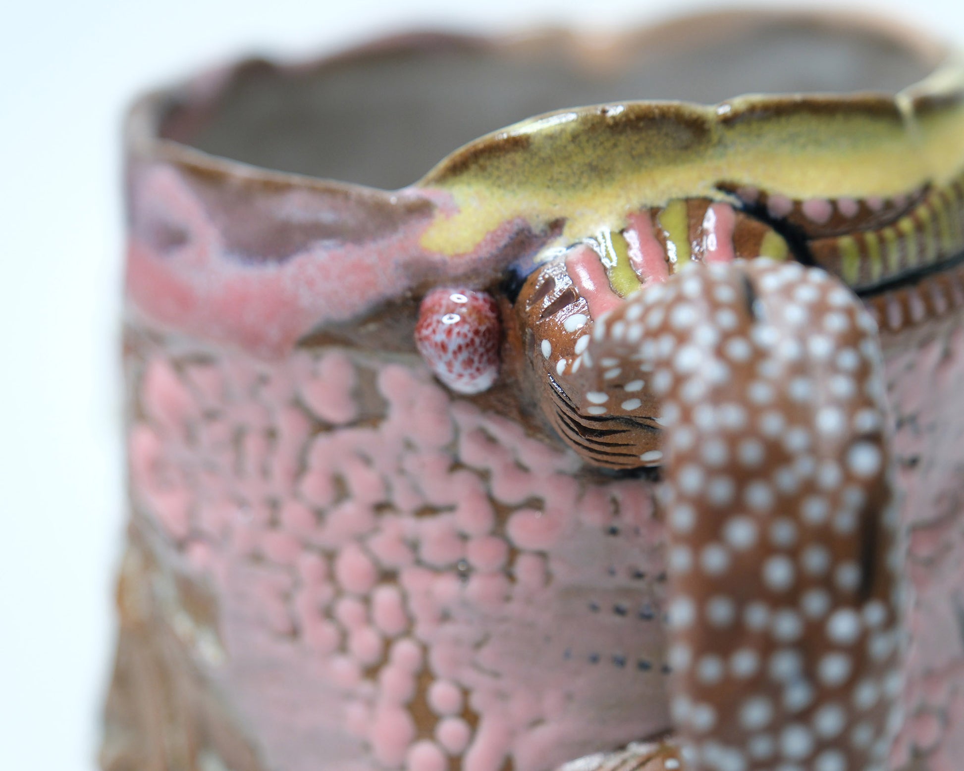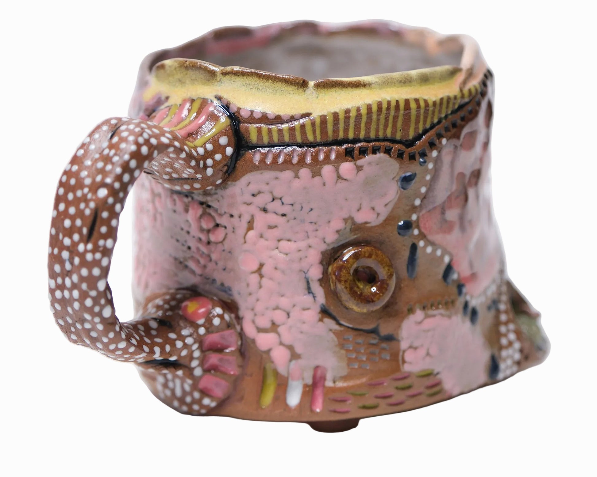 Part of the statement collection in a pink and yellow color palette. Each mug is hand built and glazed individually allowing for each one to be unique.